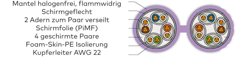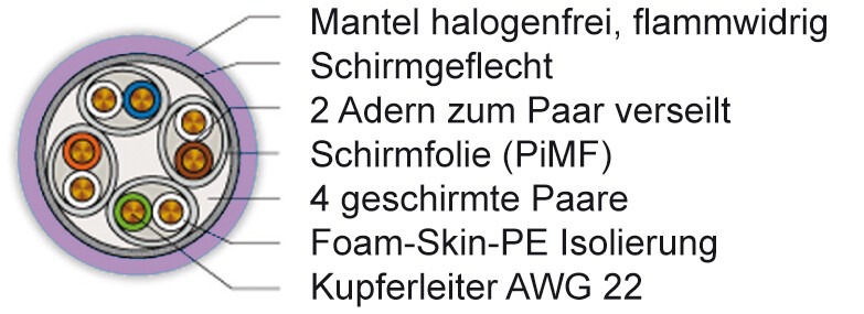 • Material: Mantel: Copolymer, thermoplastisch; Aderisolierung: Polyethylen geschäumt, beschichtet (Foam/Skin PE)
